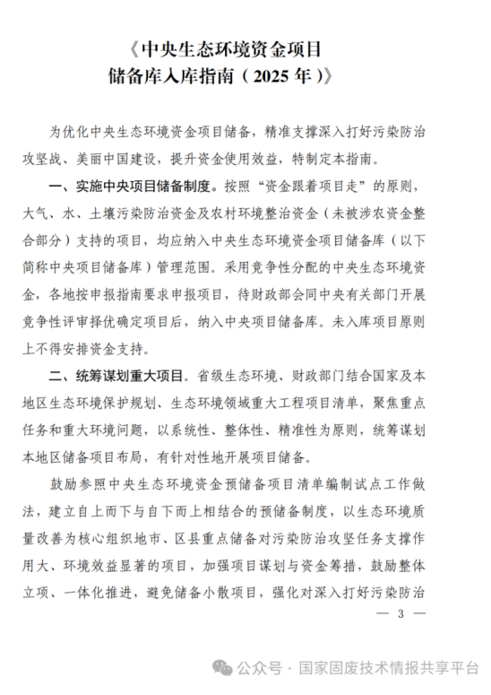 為深入貫徹黨中央、國務(wù)院有關(guān)決策部署,提高預(yù)算安排的科學(xué)性、規(guī)范性和前瞻性,進(jìn)一步充分發(fā)揮中央生態(tài)環(huán)境資金項(xiàng)目儲備庫作用,對持續(xù)深入打好污染防治攻堅(jiān)戰(zhàn)和推進(jìn)美麗中國建設(shè)形成有力支撐,根據(jù)《生態(tài)環(huán)境領(lǐng)域中央和地方財(cái)政事權(quán)和支出責(zé)任劃分改革方案》《中央生態(tài)環(huán)保轉(zhuǎn)移支付資金項(xiàng)目儲備制度管理暫行辦法》《中央生態(tài)環(huán)境資金項(xiàng)目管理規(guī)程》以及生態(tài)環(huán)境資金管理辦法等有關(guān)文件,生態(tài)環(huán)境部、財(cái)政部修訂了《中央生態(tài)環(huán)境資金項(xiàng)目儲備庫入庫指南(2025年)》。(來源:農(nóng)村污水)